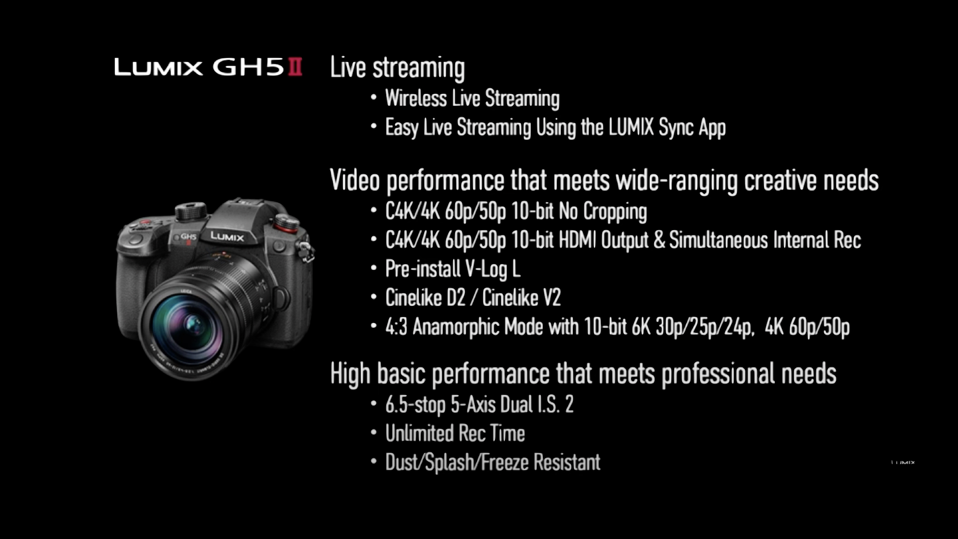 Le GH5M2, qui exploite tout le savoir-faire de Panasonic dans l’univers cinéma et broadcast et se dote de spécificités dédiées aux professionnels exigeants notamment au travers des fonctionnalités suivantes ….